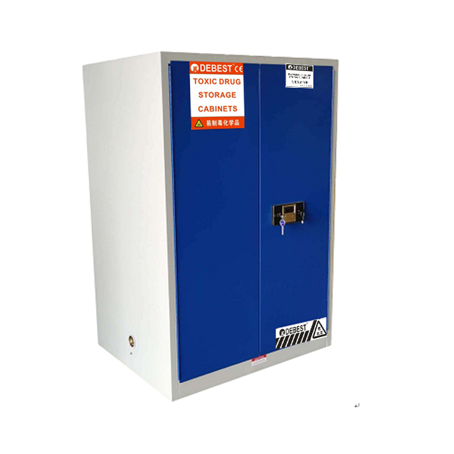 1:DEBEST剧毒药品储存柜整体为双层1.2mm防火钢板构造,两层钢板之间间隔40mm,内填特种防火材料,防火性能更为卓越。柜体采用全焊接,非铆结构使其拥有更长的使用时间,因为减少了空气间隙可在着火时提供更好的防护。
