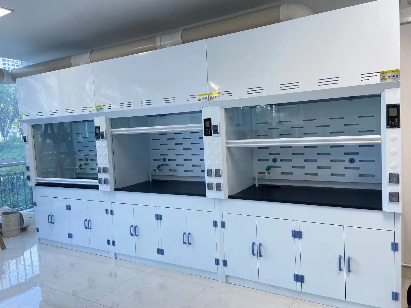 【操作台面】:台面采用8-12mmPP板制作,耐酸碱性能优异。通风柜台面上水槽根据用户要求配置。可选环氧树脂台面或实芯理化板台面。